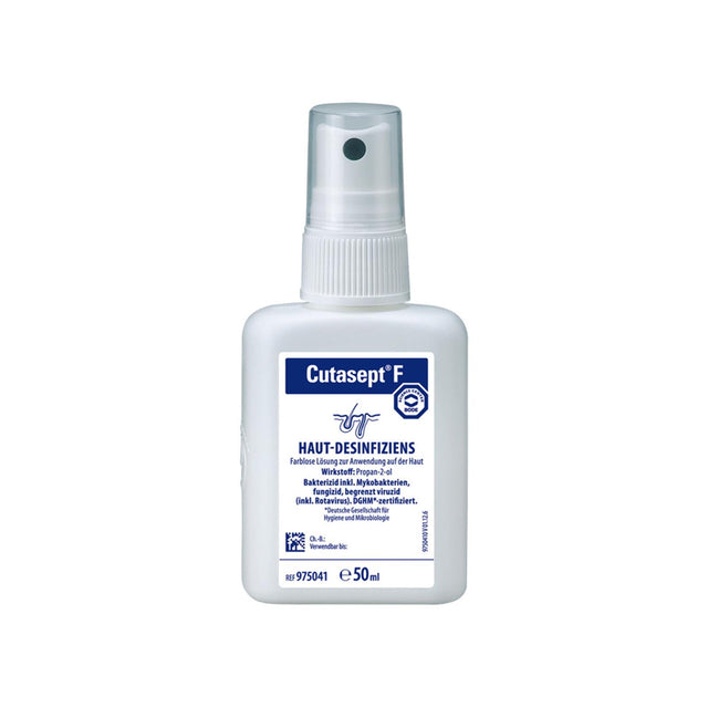 Cutasept® F ist gebrauchsfertig und wird direkt auf die zu desinfizierende Hautpartie aufgesprüht/aufgetragen. Der Sprühvorgang sollte in einem möglichst geringen Abstand zum betreffenden Hautareal er folgen, um eine ausreichende Benetzung sicherzustellen und eine Aerosolbildung zu vermeiden. Alternativ kann Cutasept® F auf einen sterilen Tupfer aufgesprüht werden. Anschließend wird die zu desinfizierende Hautpartie mit dem Tupfer abgerieben. Dabei ist auf eine satte Benetzung des Hautareals zu achten.