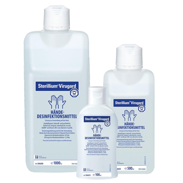 Hygienische Händedesinfektion:Ausreichend (mind. 4 ml) Sterillium® Virugard® unverdünnt in die trockenen Hände einreiben, dabei alle Hautpartien erfassen. Besonders auf Fingerkuppen und Daumen achten. Die Hände über die gesamte Einwirkzeit von 30 Sekunden feucht halten.