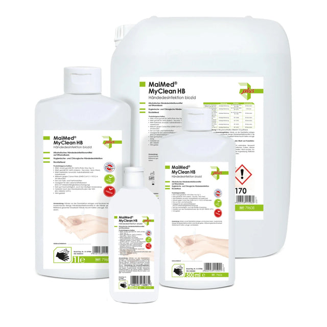 MaiMed® MyClean HB erfüllt die Anforderungen der europäischen Normen für Händedesinfektion und gewährleistet eine hohe Wirksamkeit gegen eine breite Palette von Krankheitserregern. Es ist in verschiedenen Verpackungsgrößen erhältlich, von handlichen Flaschen für unterwegs bis hin zu größeren Gebinden für den professionellen Einsatz.