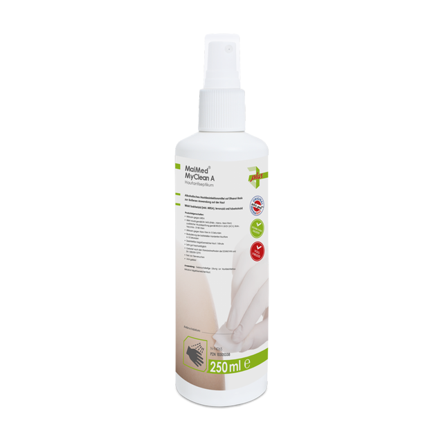 MaiMed® MyClean A ist ein leistungsstarkes, alkoholisches Hautdesinfektionsmittel, das speziell für die Desinfektion von talgdrüsenreicher Haut entwickelt wurde. Es bietet eine umfassende antimikrobielle Wirksamkeit und eliminiert zuverlässig Bakterien und Viren. Ideal geeignet für den Einsatz in Bereichen mit hohen Hygieneanforderungen, wie Krankenhäusern, Arztpraxen und Pflegeheimen. Das Hautdesinfektionsmittel wurde nach den Standardmethoden der VAH und EN 1500/EN 12791 getestet und ist VAH-gelistet. Es erfüllt alle relevanten Anforderungen an die Hygiene in medizinischen Einrichtungen und ist in einem praktischen, gebrauchsfertigen 250ml-Gebinde erhältlich.