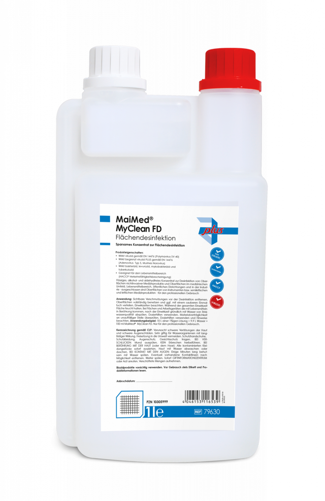 MaiMed® MyClean FD ist ein konzentriertes, alkoholfreies Flächendesinfektionsmittel für den universellen, großflächigen Einsatz. Es bietet eine hohe Wirksamkeit gegen Bakterien und Viren und ist ideal für den Einsatz in Bereichen mit strengen Hygieneanforderungen, wie Krankenhäusern, Arztpraxen, Pflegeeinrichtungen sowie in Laboren. Aufgrund der niedrigen Anwendungskonzentration ist es hochgradig wirtschaftlich. Durch die materialschonende Formulierung kann es auf einer Vielzahl von Oberflächen eingesetzt werden, ohne diese zu beschädigen. Es ist aldehydfrei und hinterlässt keine unangenehmen Gerüche.