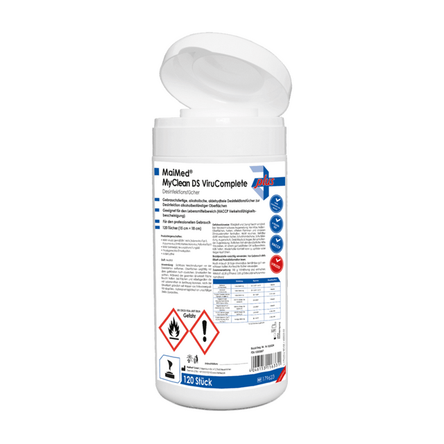 Mit dem ablösbaren Etikett von MaiMed® MyClean DS ViruComplete Desinfektionstücher à 150 Blatt zur eindeutigen Kennzeichnung bekleben und zusätzlich mit dem Datum der Befüllung sowie die Haltbarkeitsdauer der Befüllung (max. 28 Tage) versehen.