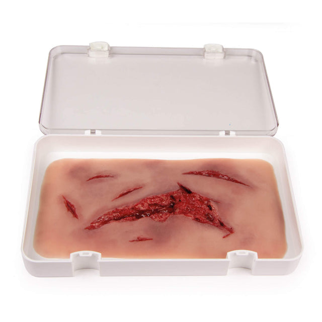 Die Erler-Zimmer Risswunde groß mit Blutungsfunktion ist ein realistisches medizinisches Trainingsmodell, das zur Simulation und Übung von Wundversorgung und Notfallmaßnahmen dient.