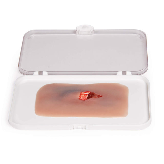 Die Erler Zimmer Wundmoulage "Offener Knochenbruch" ist ein realistisches medizinisches Trainingsmodell, das zur Simulation und Übung von Notfallmaßnahmen bei offenen Frakturen dient.