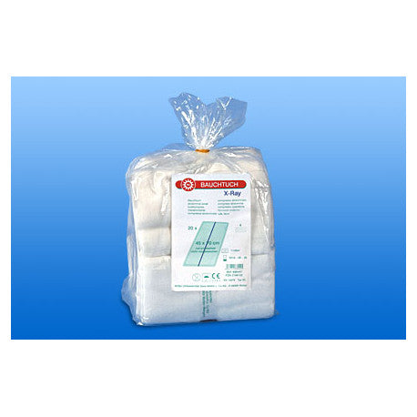 Das unsterile, nicht vorgewaschene Bauchtuch wird aus 4-fach gelegtem, 20- fädigem Verbandmull hergestell. Dazu werden 4 Lagen Mull mit eingewebtem X-Ray-Faden vernäht. Das Bauchtuch erhält keine Schlaufe. Im operativen Bereich wird es zum Aufsaugen von Blut und Sekrekt oder zum Schutz von Weichteil- bzw. Organgewebe verwendet. Die Einweg-Bauchtücher müssen vor der Verwendung sterilisiert werden. 20 Bauchtücher sind in einem Beutel verpackt.