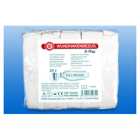 Wundhakenbezüge sind einlagige, genähte, weiße Überzüge aus medizinisch gebleichtem Baumwollgestrick mit Zugbändern. Sie werden vor der Sterilisation zum Schutz des Instrumentariums auf die Wundhaken gezogen und sind für den einmaligen Gebrauch bestimmt. Sie können während der Verwendung auf dem Wundhaken belassen werden und reduzieren dabei das Blendverhalten der Wundhaken im OP-Licht und schützen empfindliche Gewebe vor den Wundhakenkanten. In den Rand der Wundhakenbezüge ist ein X-Ray Faden eingearbeitet. 20 Wundhakenbezüge befinden sich in einer Packung.